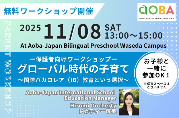 アオバジャパン・バイリンガルプリスクール早稲田キャンパスでは、国際バカロレア(IB)教育に触れる保護者参加型ワークショップを開催いたします。